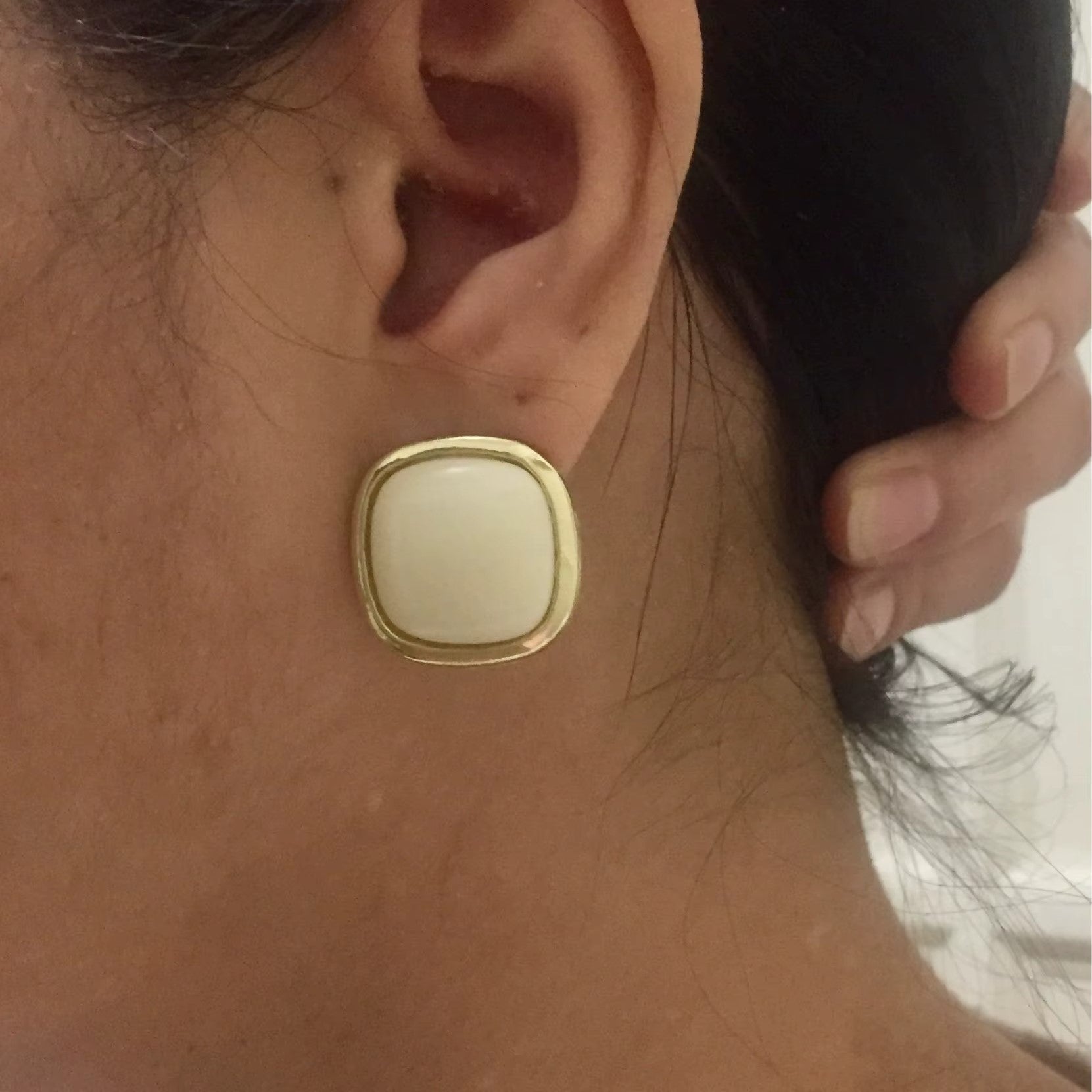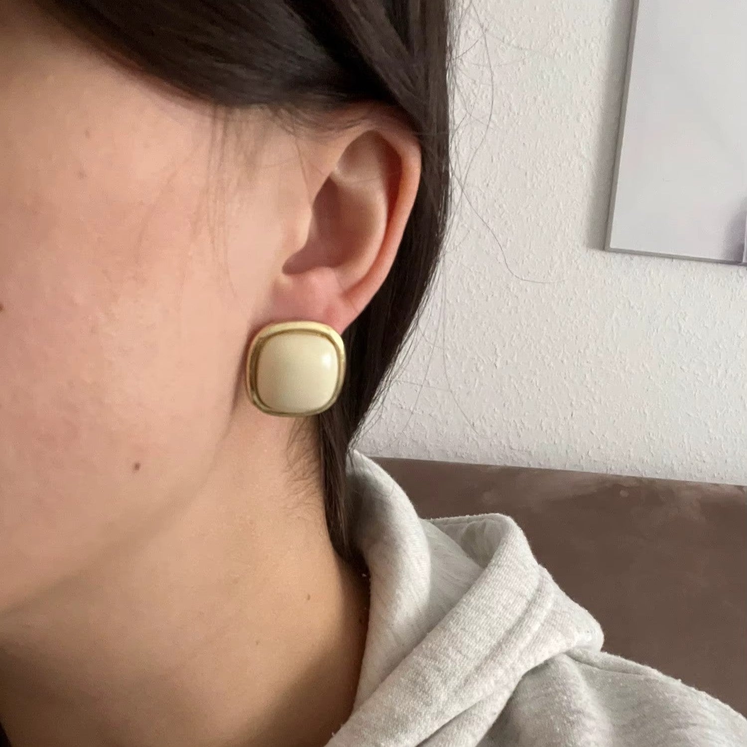 Los pendientes están fabricados con resina de alta calidad en color crema, un material ligero, resistente y cómodo de llevar. El borde exterior está bañado en auténtico oro de 18 quilates, lo que aporta un brillo sutil y elegante que no se desgasta con el uso habitual.